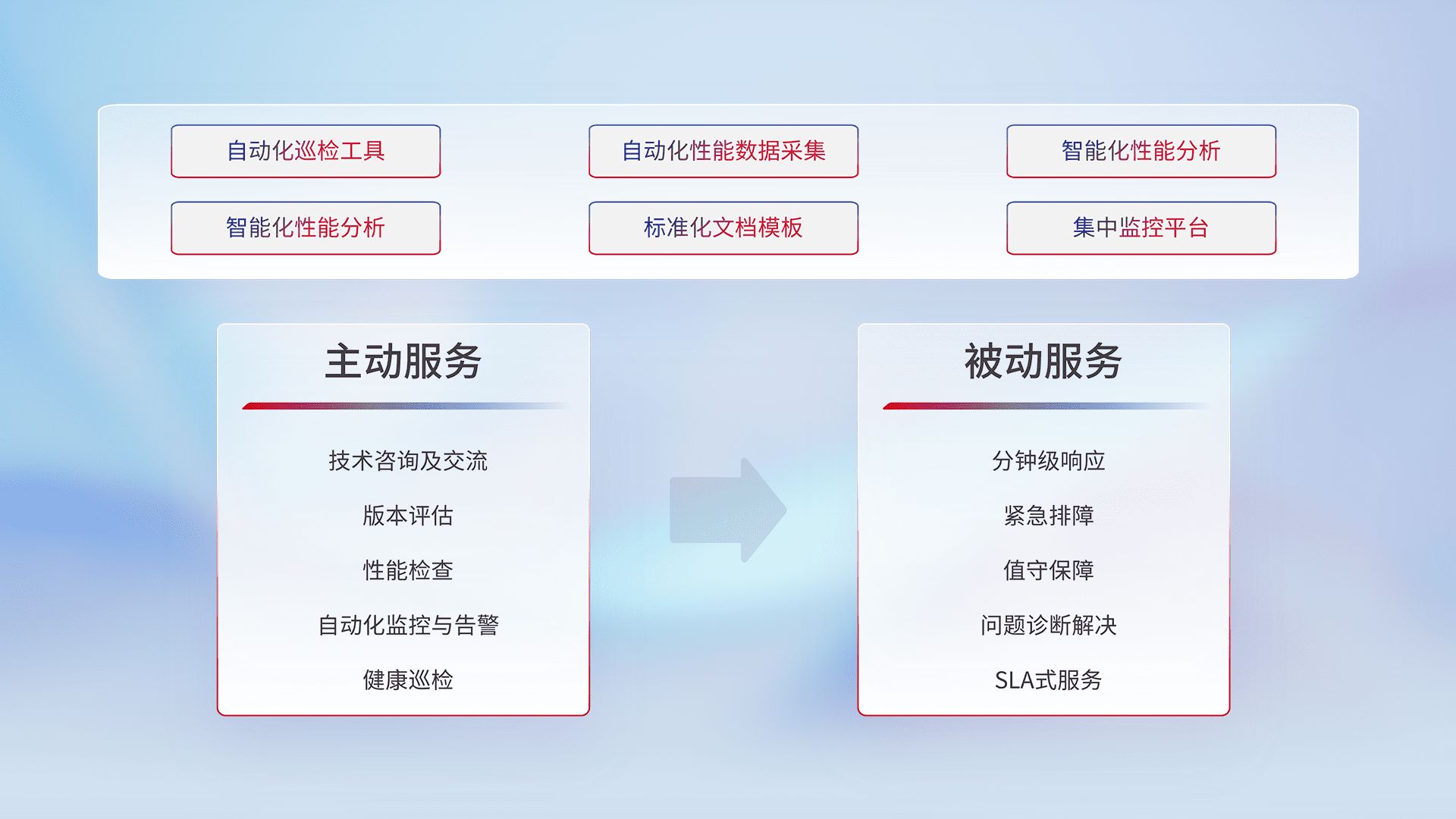 智能化工具和标准化文档,,保障服务质量,,,提供主动服务(包含技术咨询、、版本评估、、性能检查、、、、自动化监控与告警、、、、健康巡检)和被动服务包含(分钟级响应、、紧急排障、、、值守保障、、、问题诊断解决、、SLA服务)。。。。