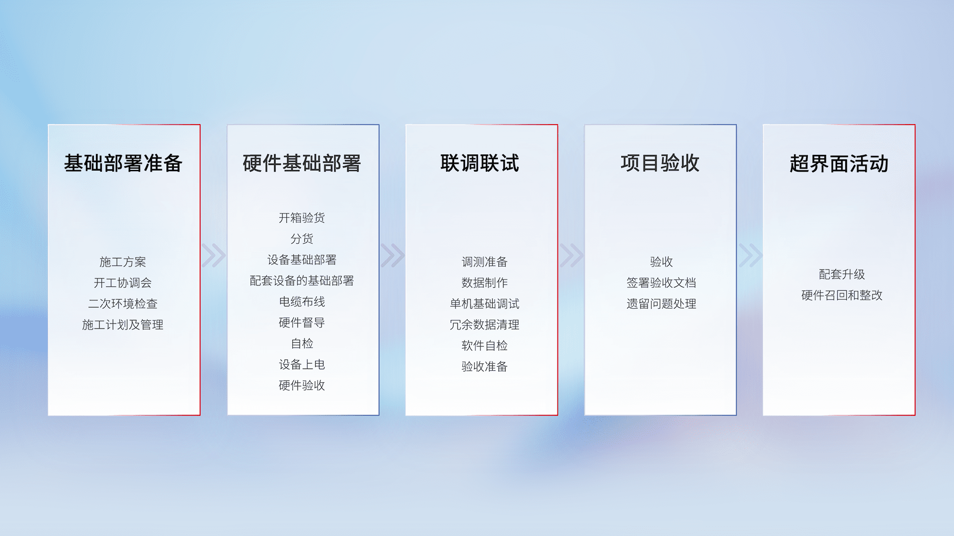 从基础部署准备、、硬件基础部署、、、联调联试、、、项目验收、、、越界面活动的全过程可追溯,,保证施工质量和进度。。